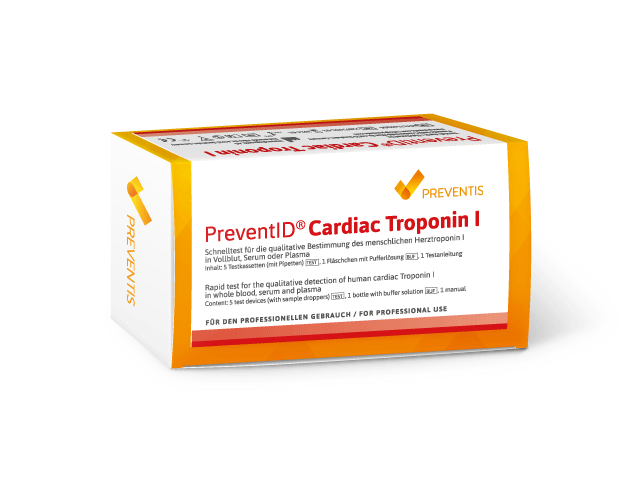Hevige pijn op de borst, eventueel gepaard gaande met kortademigheid, kan een teken zijn van een hartaanval of angina pectoris. Naast een ECG biedt de bepaling van cardiaal troponine (cardiaal troponine I) een snelle en betrouwbare diagnostiek. PreventID® Cardiac Troponin I heeft een detectielimiet van 0,5 ng/ml.